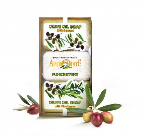 В комплект входят два натуральных оливковых мыла весом по 110 гр. каждое и пемза.